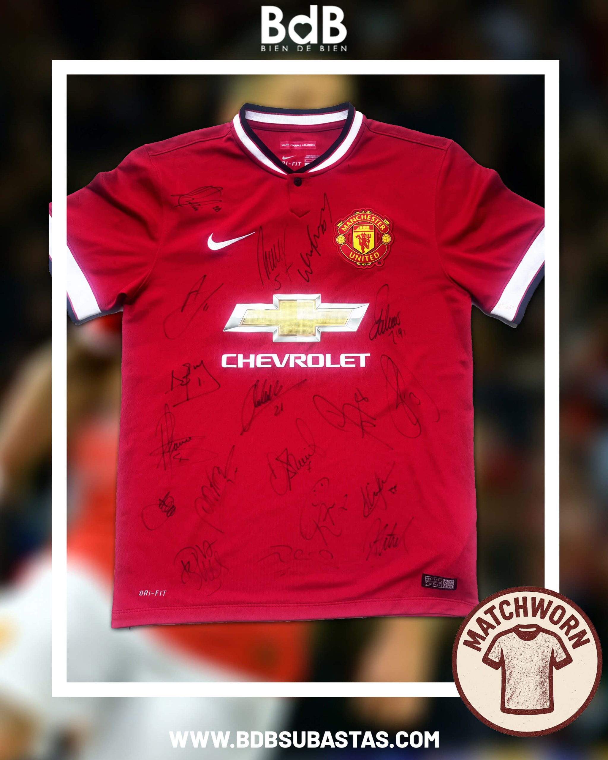 La camiseta corresponde a la lanzada por Nike para la temporada 2014/2015 de la Premier League y contiene las firmas de la mayoría del plantel del Manchester United de aquella temporada.