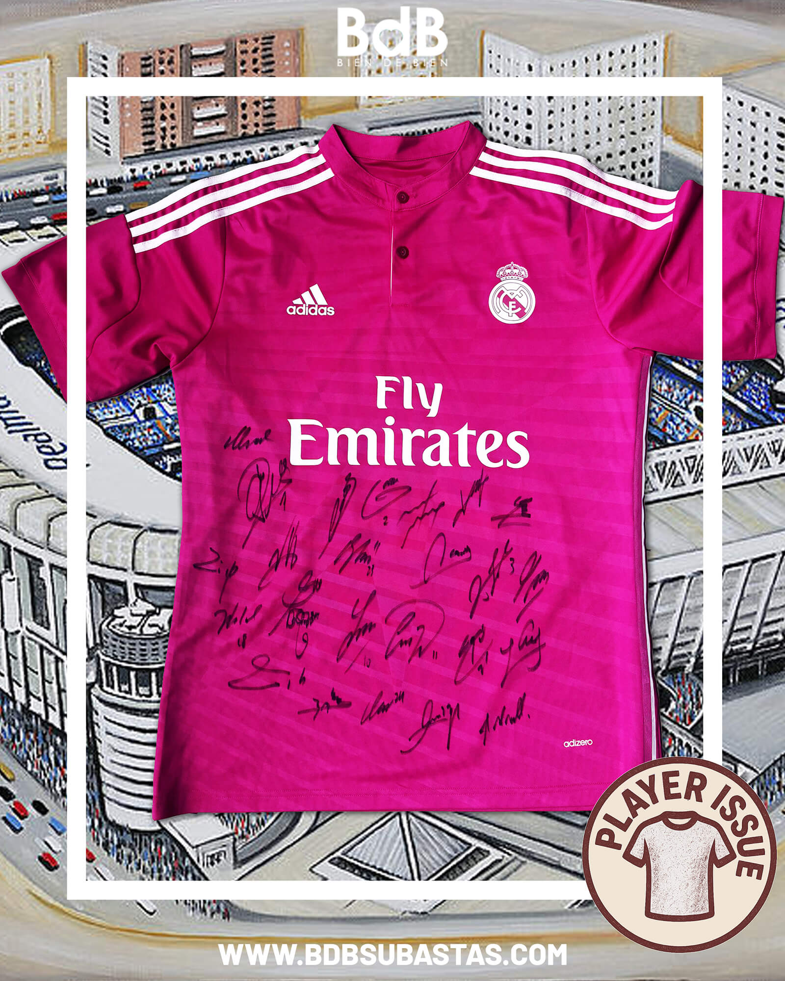 La camiseta Player Issue corresponde a la tercera equipación Adidas de Real Madrid, para la temporada 2014/2015, con la estampa 10 de James Rodríguez y la firma del plantel de aquella temporada.