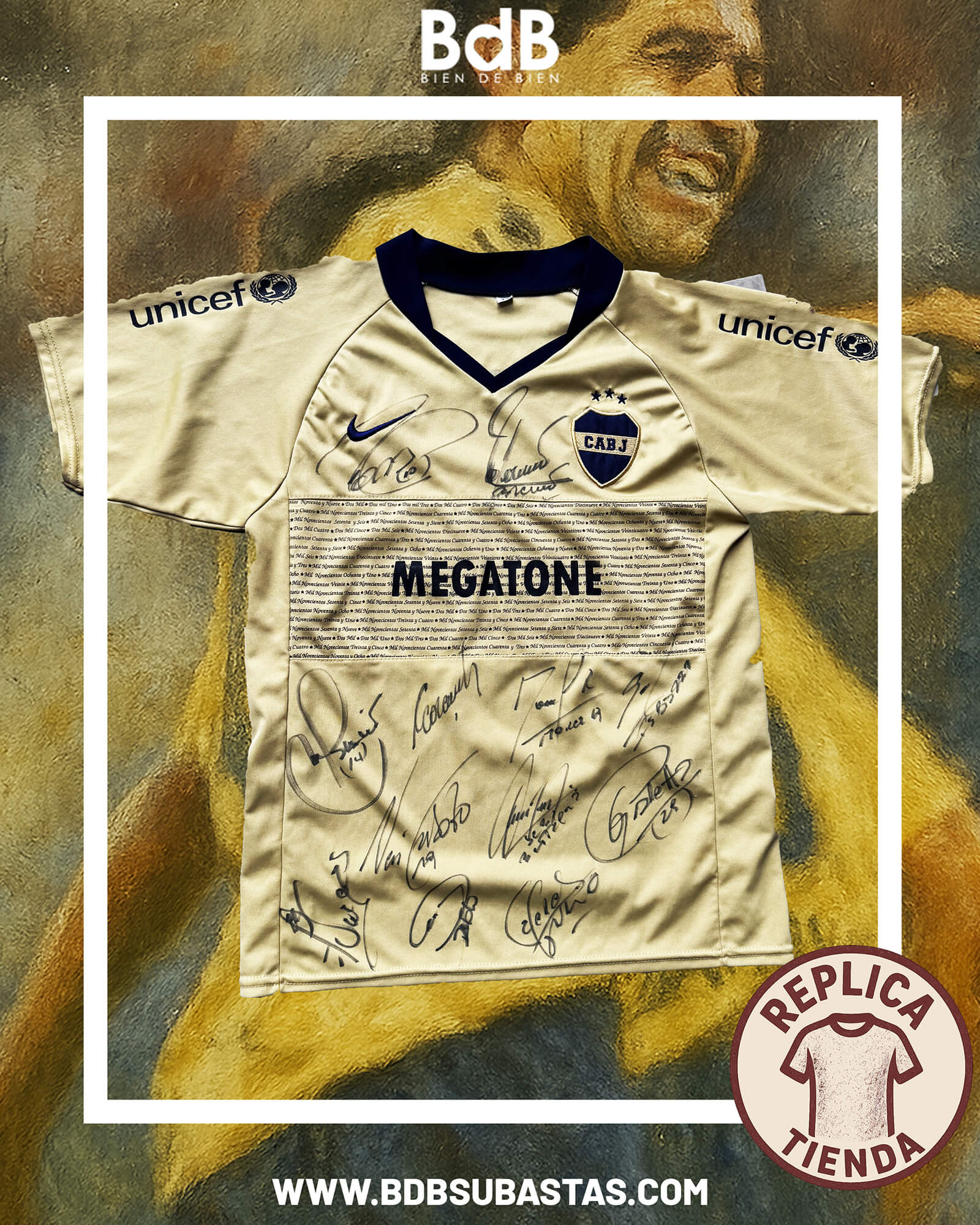 La camiseta es una réplica de tienda. Entre las firmas están, entre otros, las de Rodrigo Palacio y Juan Román Riquelme. El precio inicial de la subasta es de AR$ 150.000