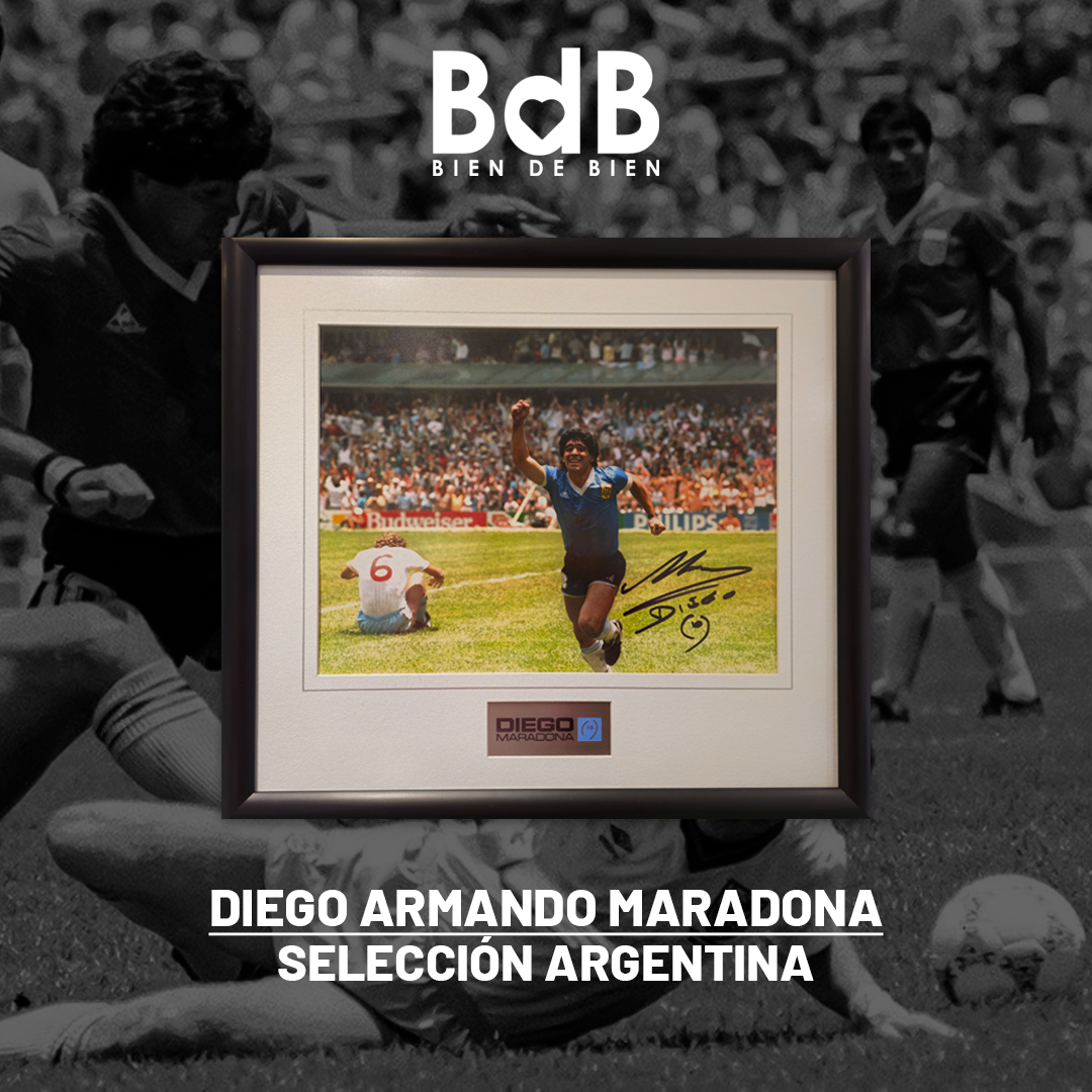 El cuadro tiene la imagen del icónico «Gol del Siglo» del Mundial de 1986, se encuentra firmado por el astro argentino y cuenta con el certificado de veracidad de la firma.